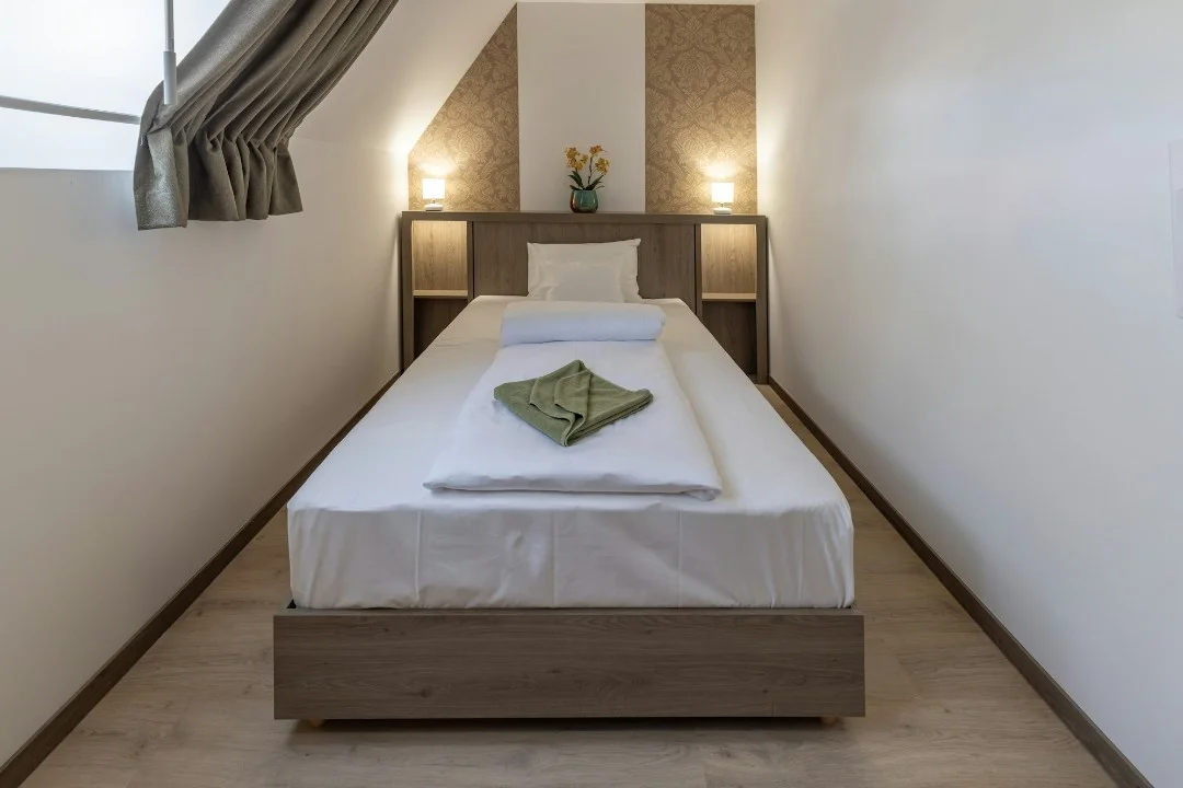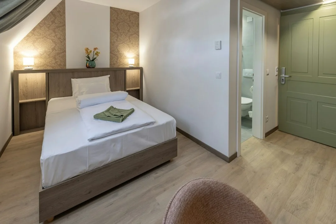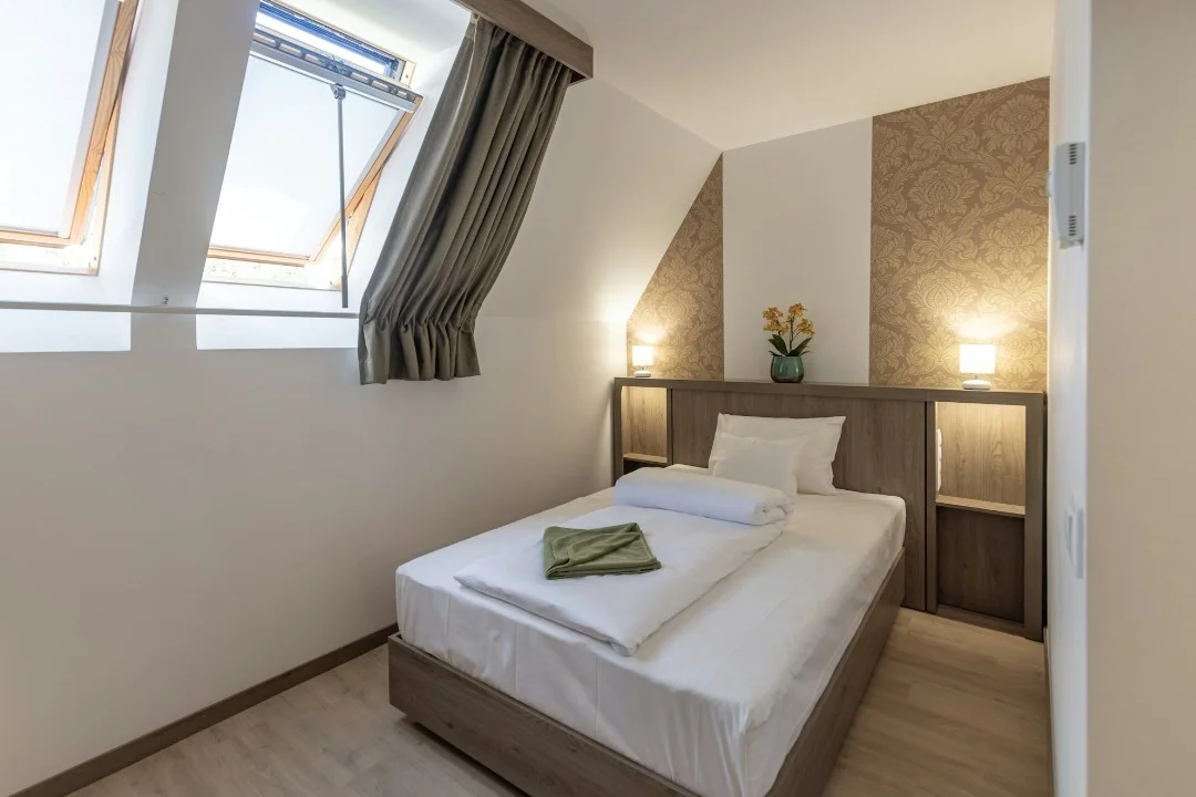 A második emeleten lévő 20 m2-es szobánk a legkisebb. A hálórészben egy 130 cm széles ágy található, így 1 fő és esetleg 1 kisgyermek részére nyújt kellemes tartózkodást. Előtér és zuhanyzós fürdőszoba tartozik hozzá.